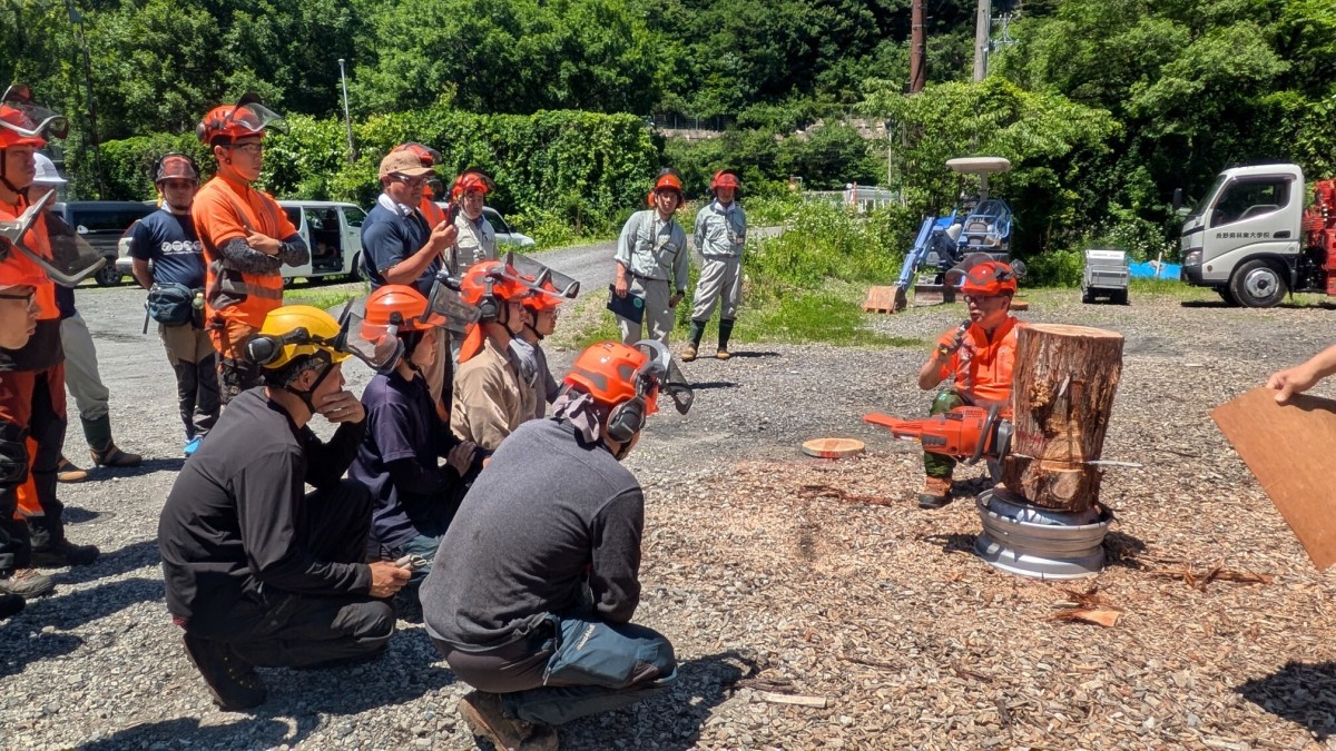 理論的にチェーンソーの正確な操作技術、安全な動作を学んだ上で、繰り返し練習に取り組むことで、安全への理解の深化と技術の向上が図られます。